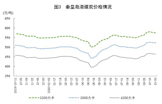 港口煤炭綜合交易價格先漲后跌。10月30日,秦皇島港5500大卡、5000大卡和4500大卡動力煤綜合交易價格分別為每噸575元、523元和464元,比9月25日分別上漲12元、14元和11元,比10月16日的年內(nèi)最高價分別下跌5元、3元和4元。